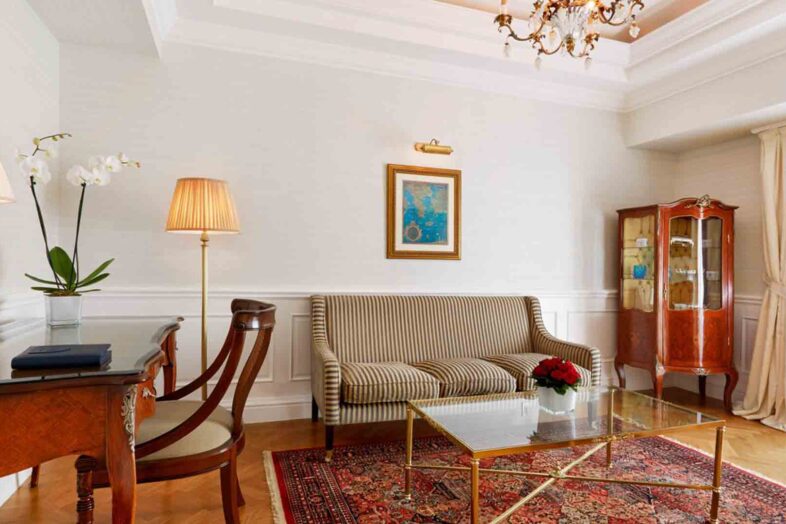 (sleeps 3): bedroom with king-sized or twin beds, rollaway bed at an extra charge, separate living room with a sofa, marble bathroom with bathtub and separate rainfall shower, balcony with courtyard view. Some of the rooms can be interconnected.