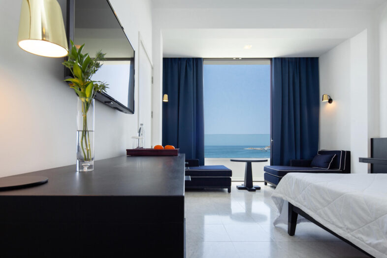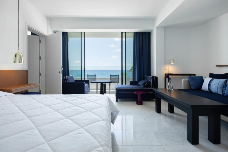 (sleeps 3): open-plan room with a double bed, extra bed is available, bathroom with bathtub and separate walk-in shower, furnished terrace with a daybed